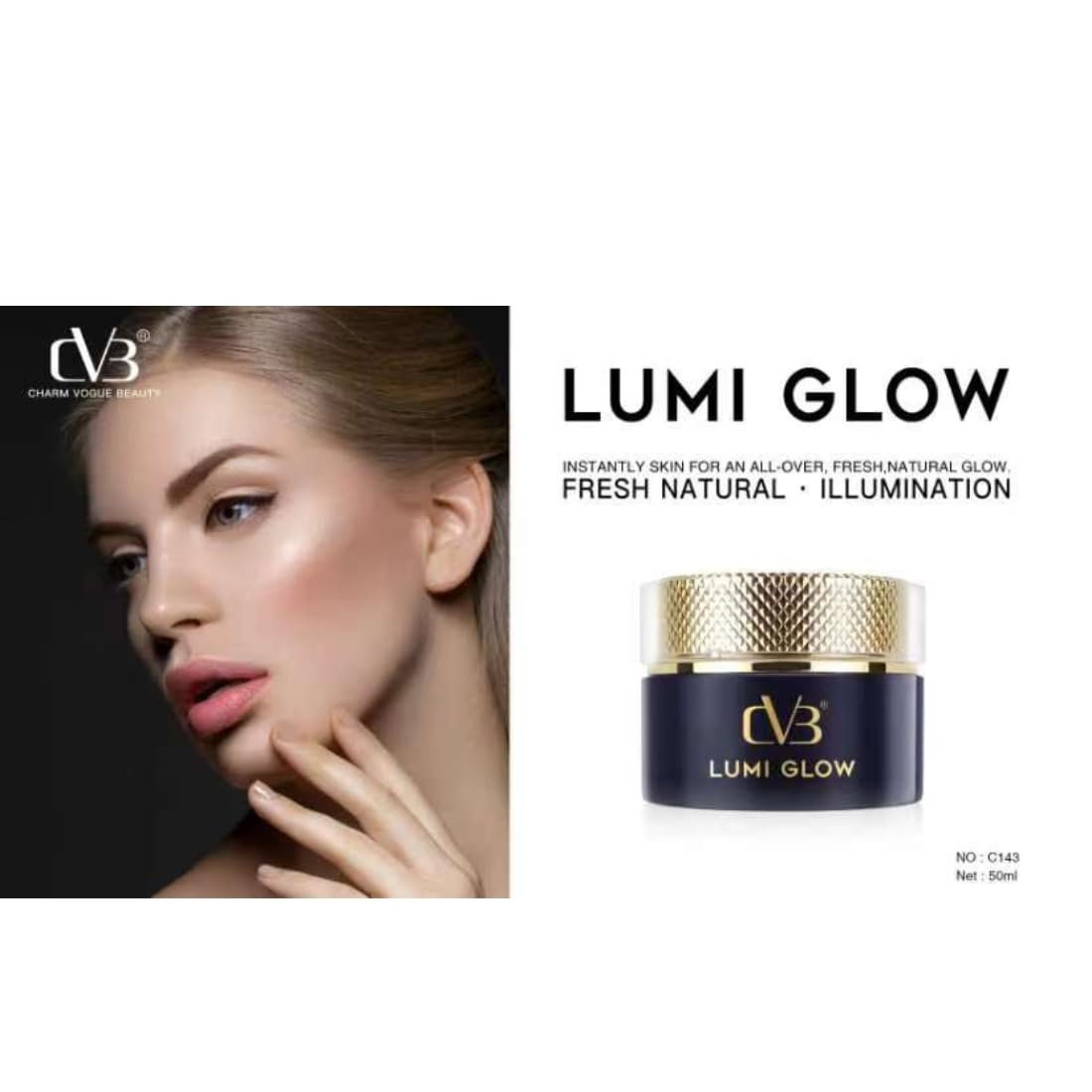 - the CVB Lumi Glow Natural Fresh Illumination appears to be a makeup product designed to provide a natural, fresh, and luminous glow to the skin. This product could be suitable for individuals looking to add radiance to their complexion for a healthy and dewy makeup look.