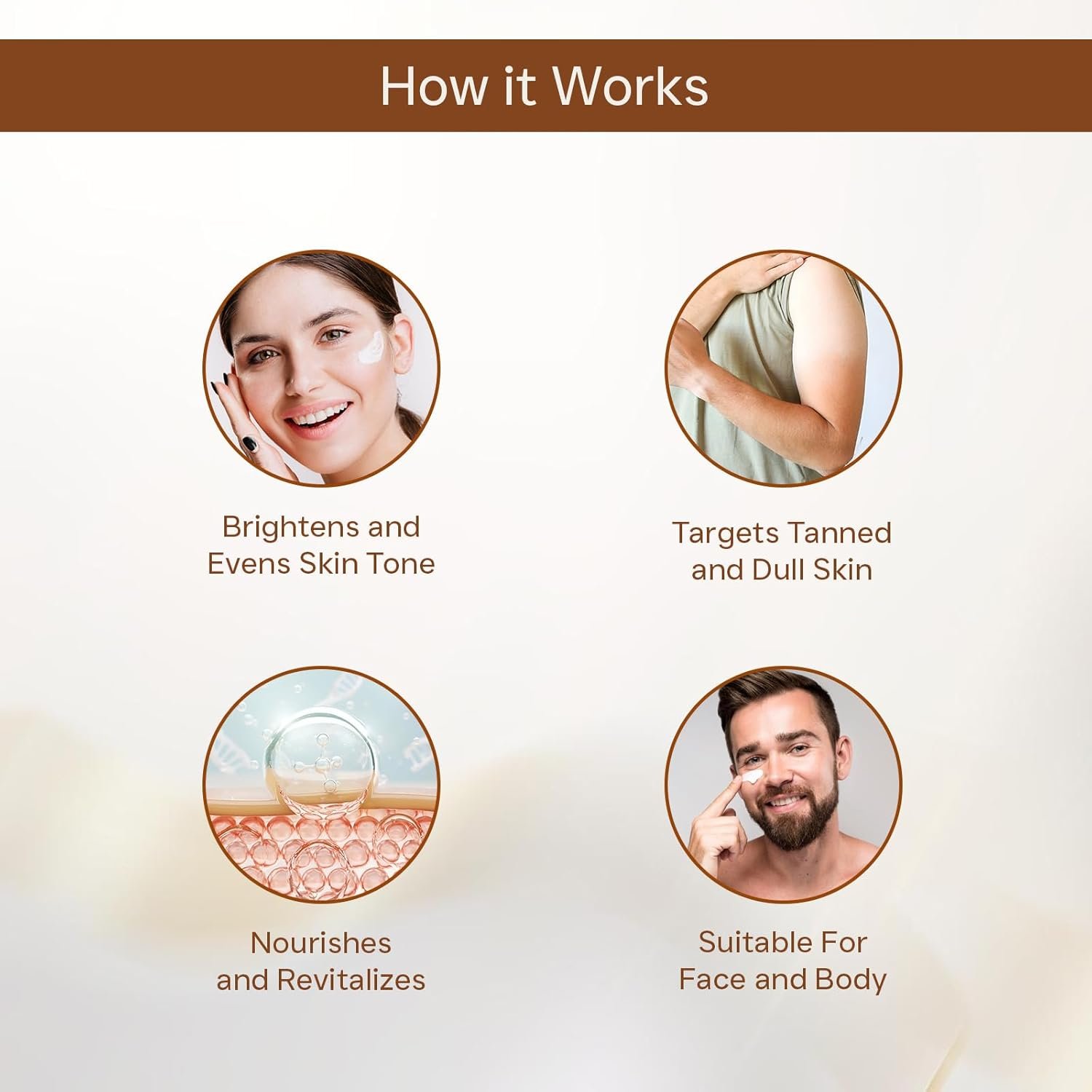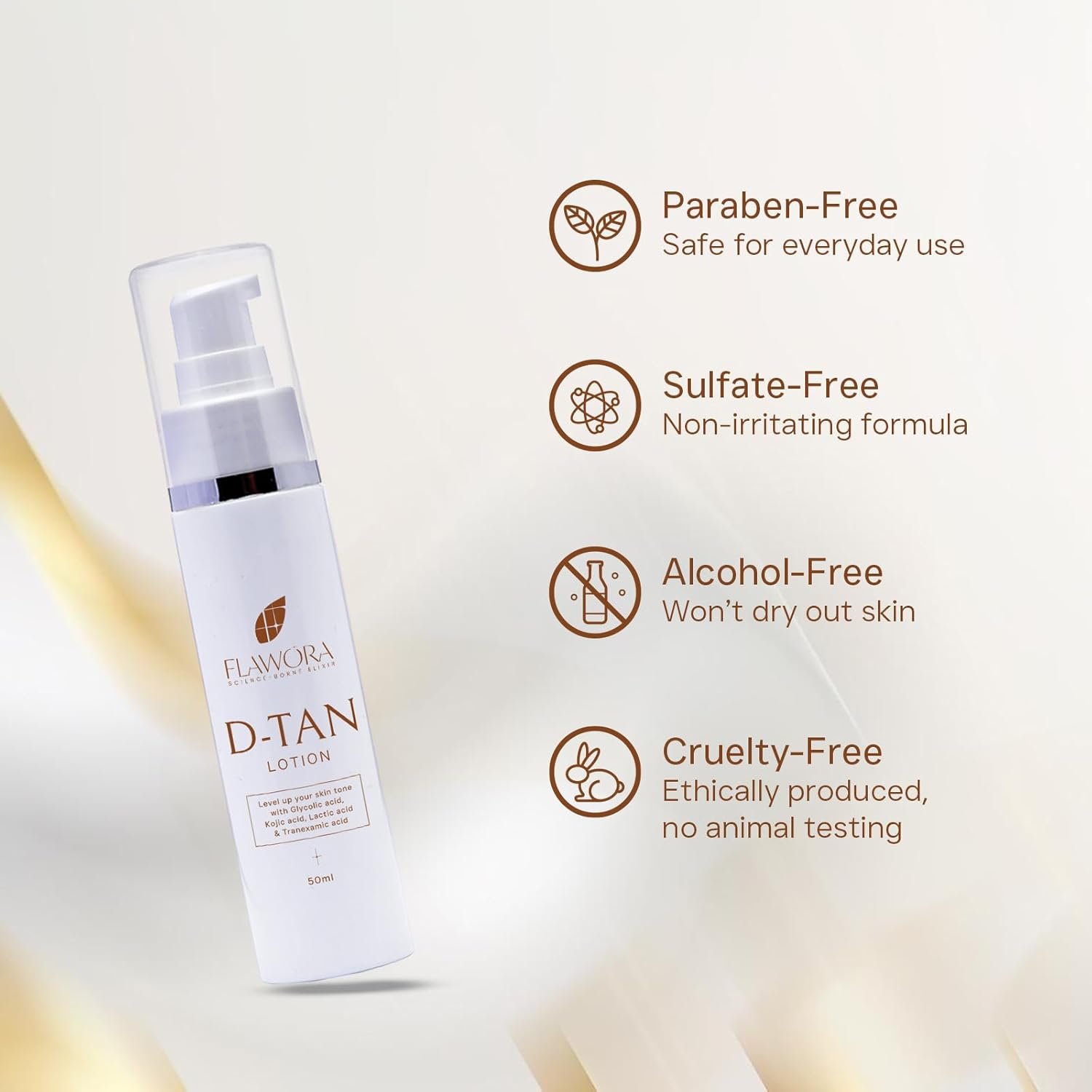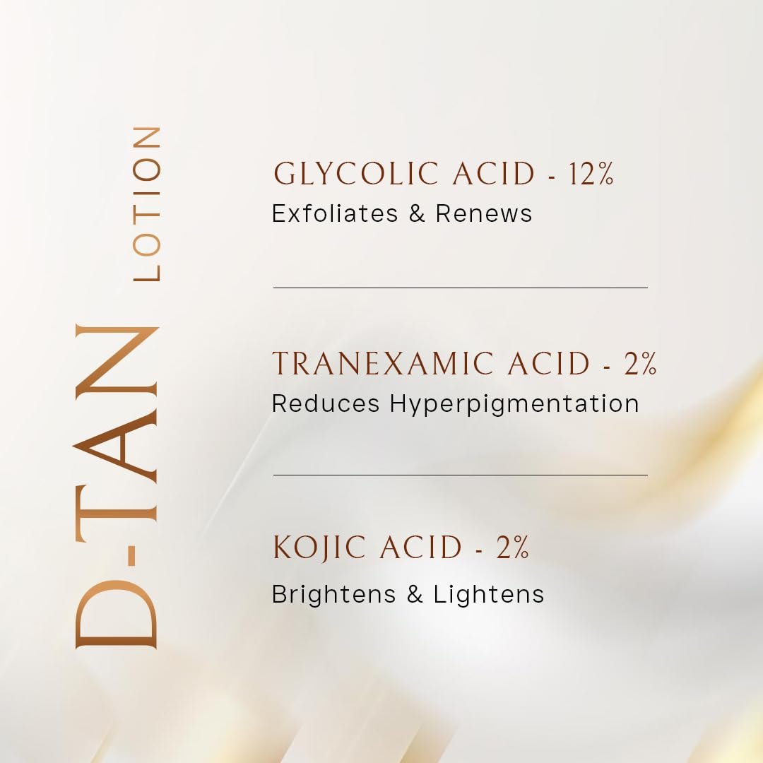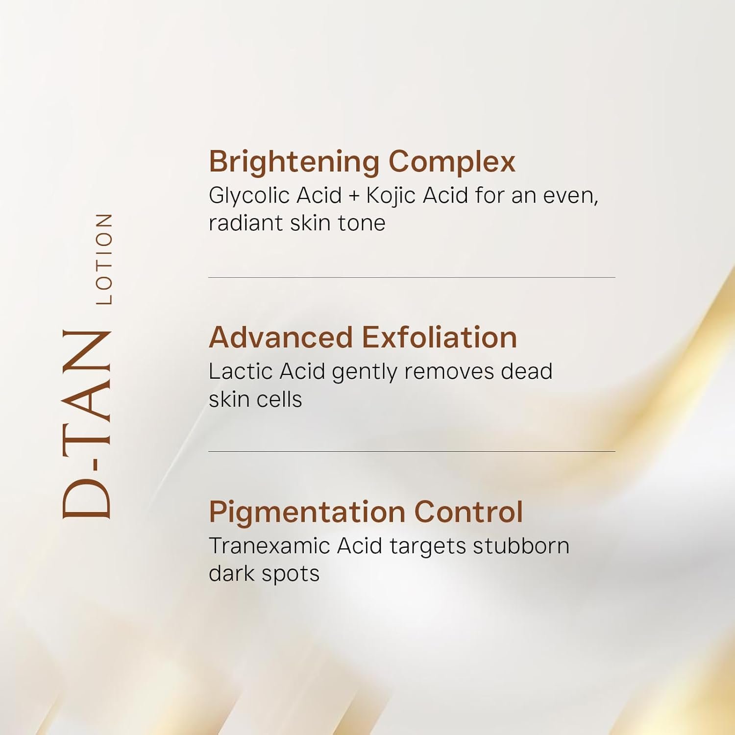 - Powerful D-Tan Formula – Infused with Glycolic, Kojic, Lactic, and Tranexamic Acids, this lotion reduces tanning, pigmentation, and discoloration while restoring skin’s natural brightness and clarity with consistent daily use.
