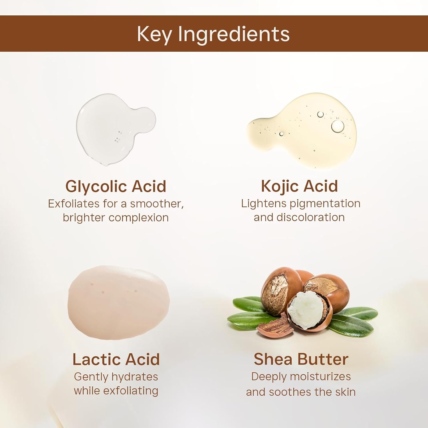 - Gentle Exfoliation & Hydration – Glycolic and Lactic Acid exfoliate dead skin cells, improve texture, and hydrate deeply, making skin smooth, supple, and soft without irritation or dryness.