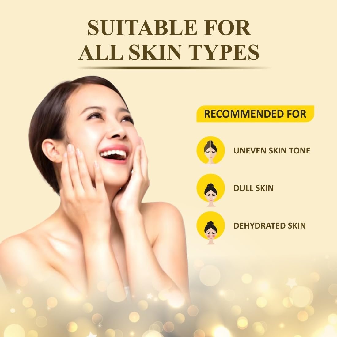 | Product Benefits | Brightens & Evens Skin Tone: Promotes a luminous, balanced complexion with regular use., Fights Signs of Aging: Reduces appearance of fine lines and wrinkles with antioxidant-rich ingredients., Removes Tan & Sunburn: Effectively fades tan, dark spots, and sunburn patches caused by UV exposure., Soothes Irritated Skin: Calms redness and inflammation with Green Tea and Pro-Vitamin B5.Brightens & Evens Skin Tone: Promotes a luminous, balanced complexion with regular use., Fights Signs of Aging: Reduces appearance of fine lines and wrinkles with antioxidant-rich |