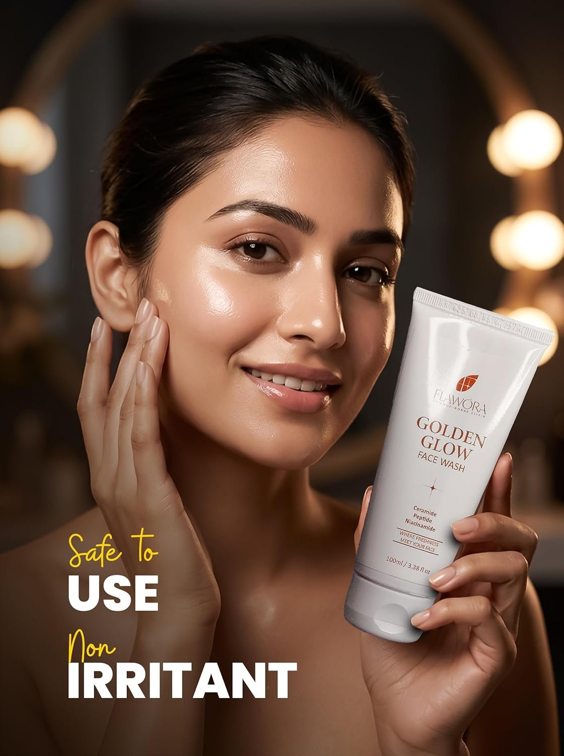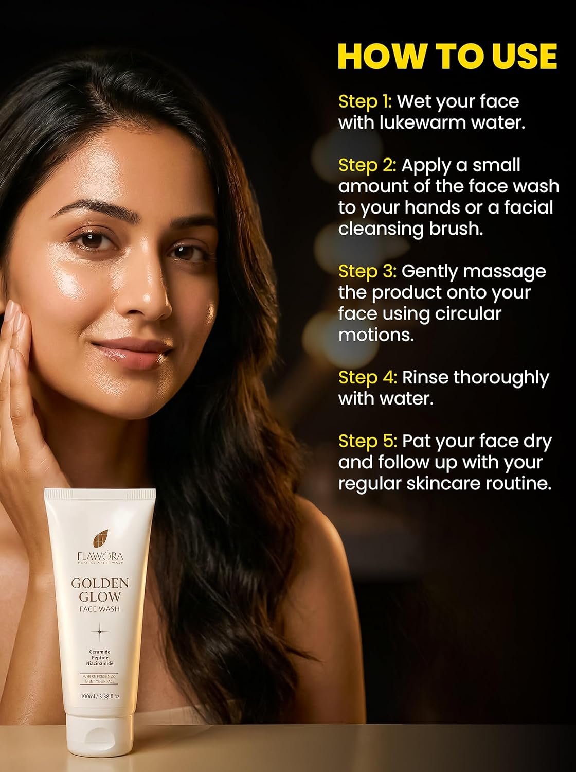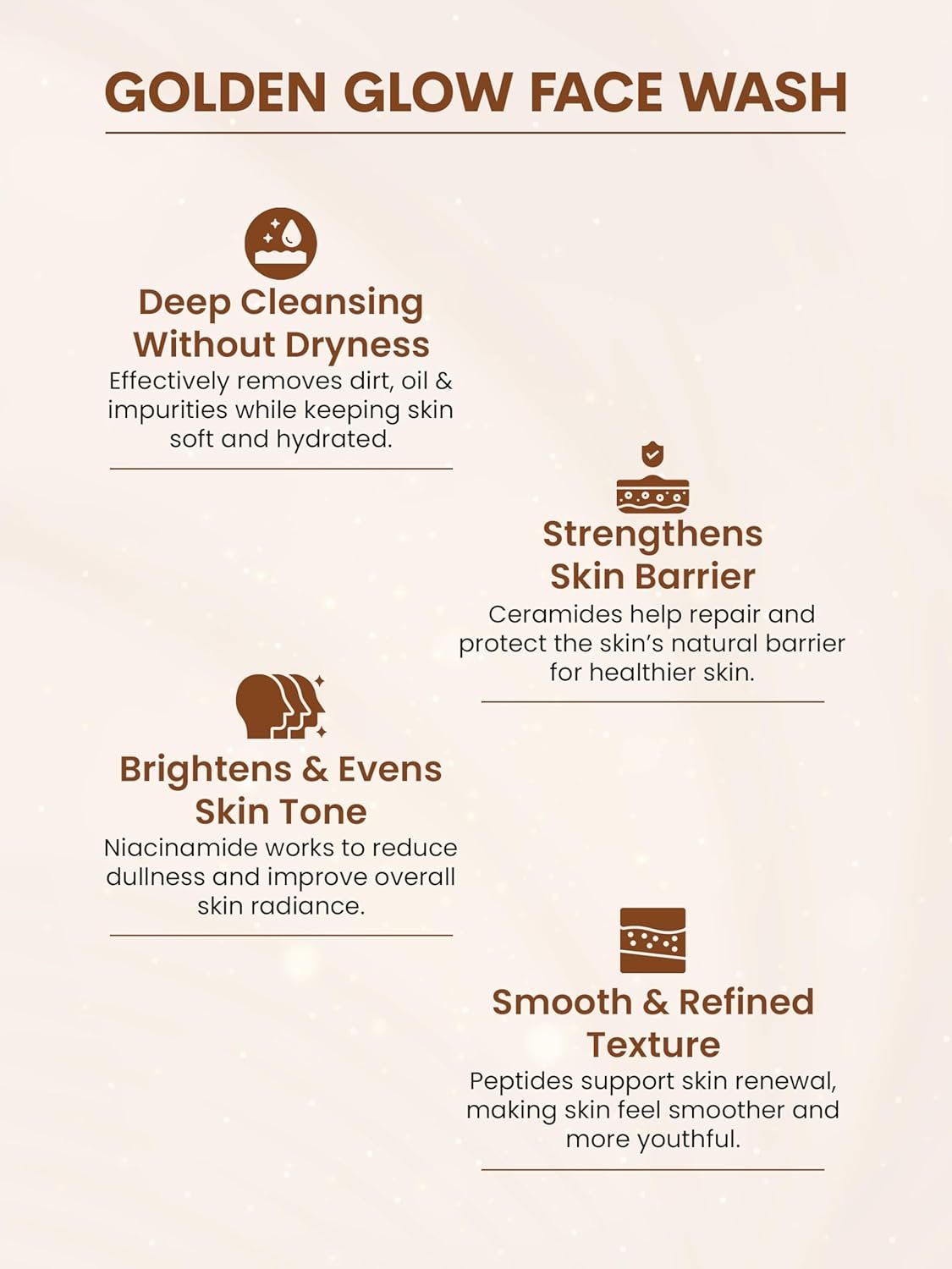 Golden Glow Face Wash with Ceramide, Peptide, Niacinamide for Brightening, Dark Spot Reduction and Moisturisation, 100mlGolden Glow Face Wash with Ceramide, Peptide, Niacinamide for Brightening, Dark Spot Reduction and Moisturisation, 100ml