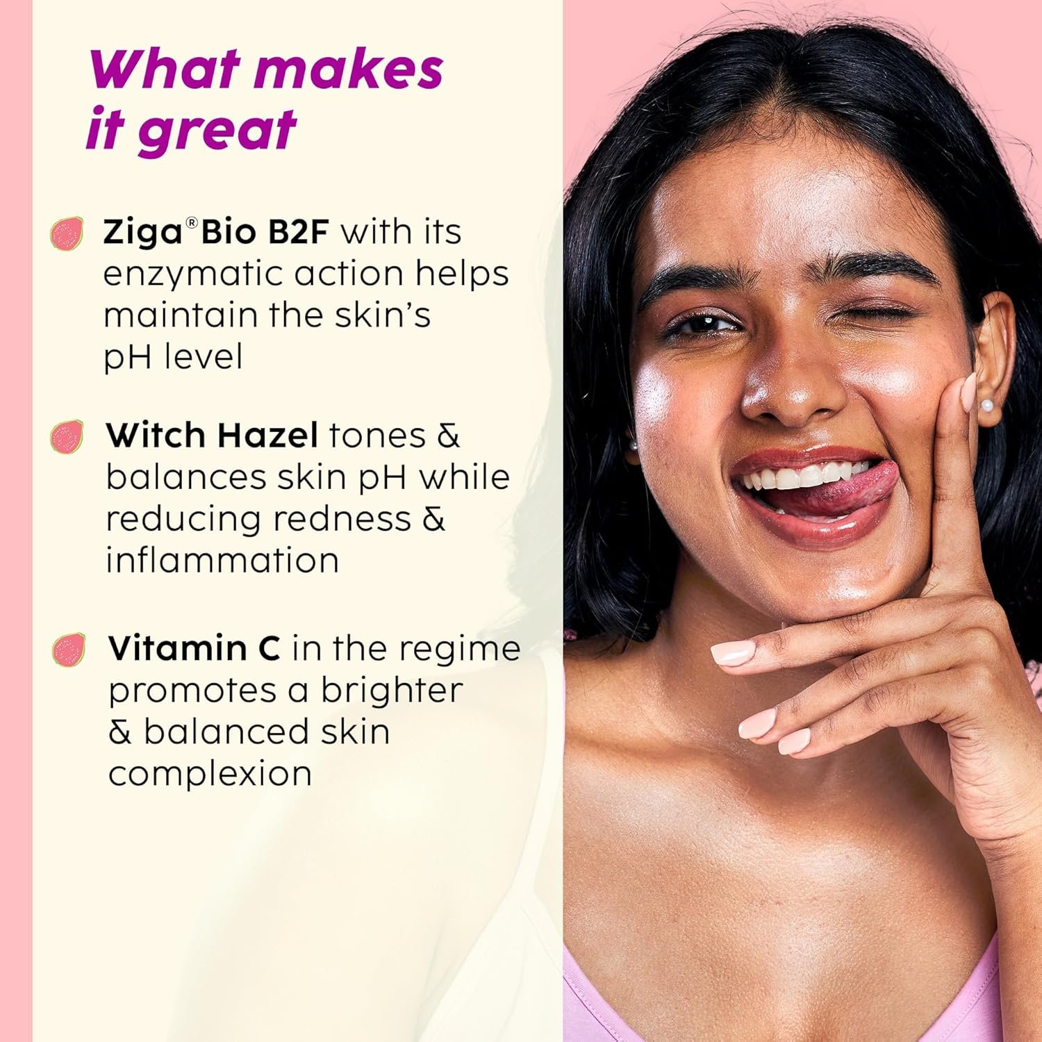 Balances pH of the skin ZigaBio B2F & Witch hazel in our fresh fruity 2-in-1 toner serum keeps skin moist & balanced while maintaining the skin’s natural pH