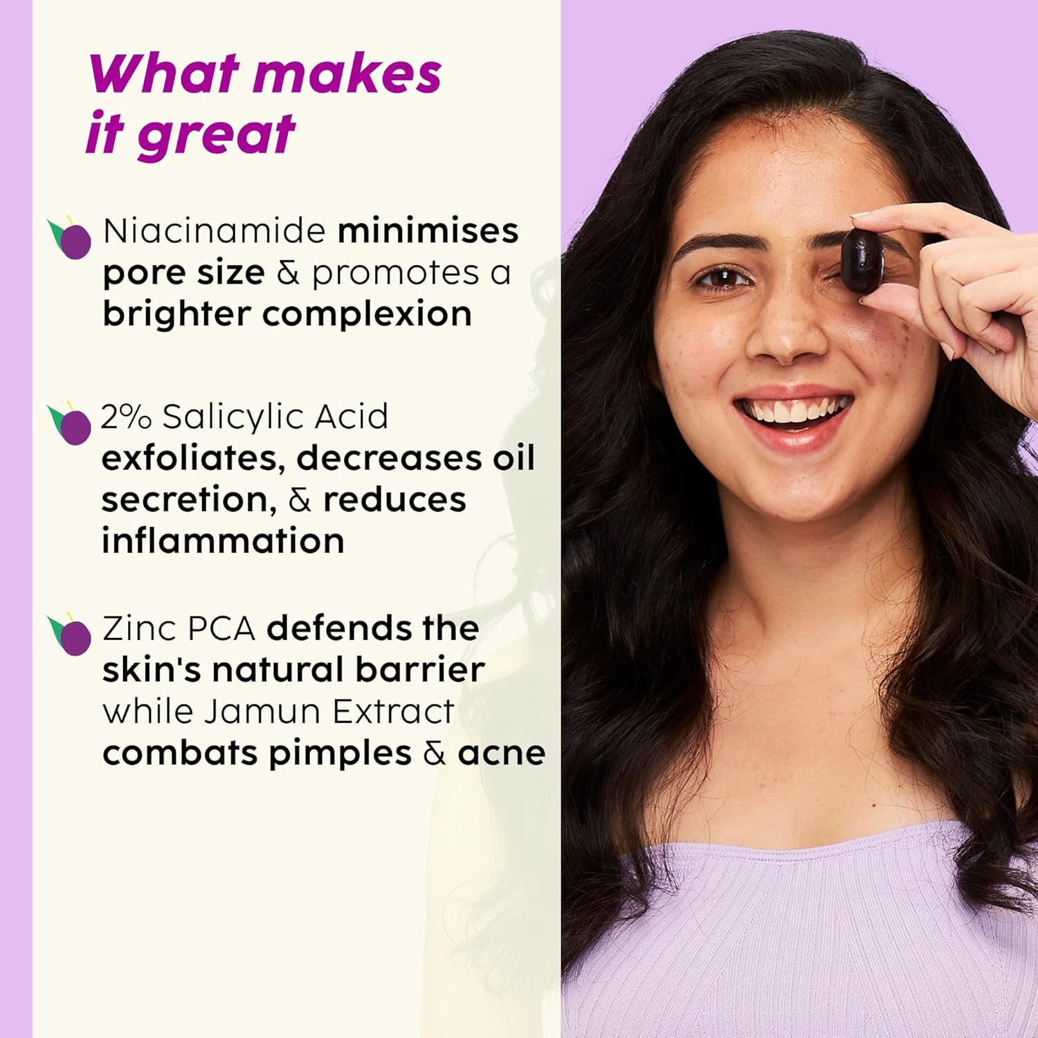 • Improved Skin Texture: Jamun’s antibacterial properties reduce active acne & restore the skin’s protective barrier.