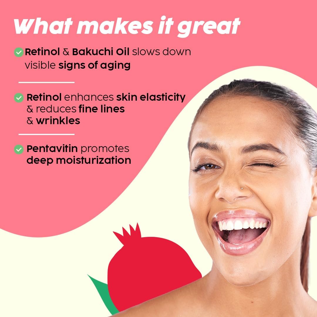 - Reduces Fine Lines & Wrinkles: Retinol & Bakuchi Oil enhances collagen production, leading to a reduction in the appearance of fine lines & wrinkles.