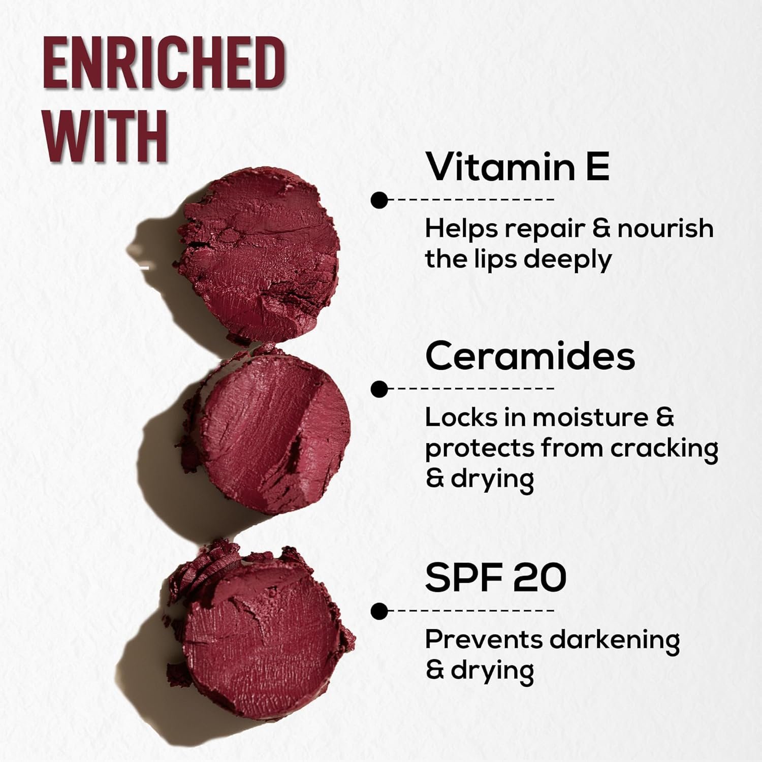- Enriched with Vitamin E, Ceramide & SPF 20: Vitamin E works tirelessly to moisturize and rejuvenate, keeping your lips soft and supple all day long. Ceramide helps fortify the delicate lip barrier, ensuring lasting hydration and protection against environmental stressors. Plus, with SPF 20, your lips are shielded from harmful UV rays, safeguarding their health and youthfulness