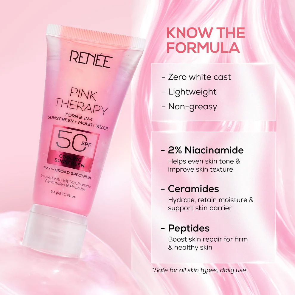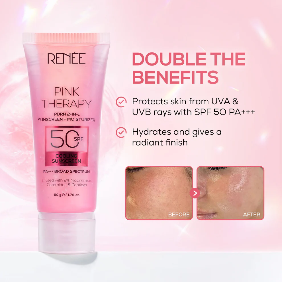 Enjoy the benefits of sun protection & hydration with RENEE PDRN 2-In-1 Sunscreen + Moisturizer SPF 50 PA+++. Enriched with Vegan PDRN, Niacinamide, Ceramides & Peptides, this 2-in-1 hydrating sunscreen helps brighten and even skin tone without leaving any visible white cast. It promotes skin repair and barrier strength while delivering a cooling sensation upon application. It’s lightweight and non-greasy texture makes it ideal for use under makeup. Upgrade your routine with RENEE’s PDRN 2-In-1 Sunscreen + Moisturizer designed for fresh, healthy-looking skin.