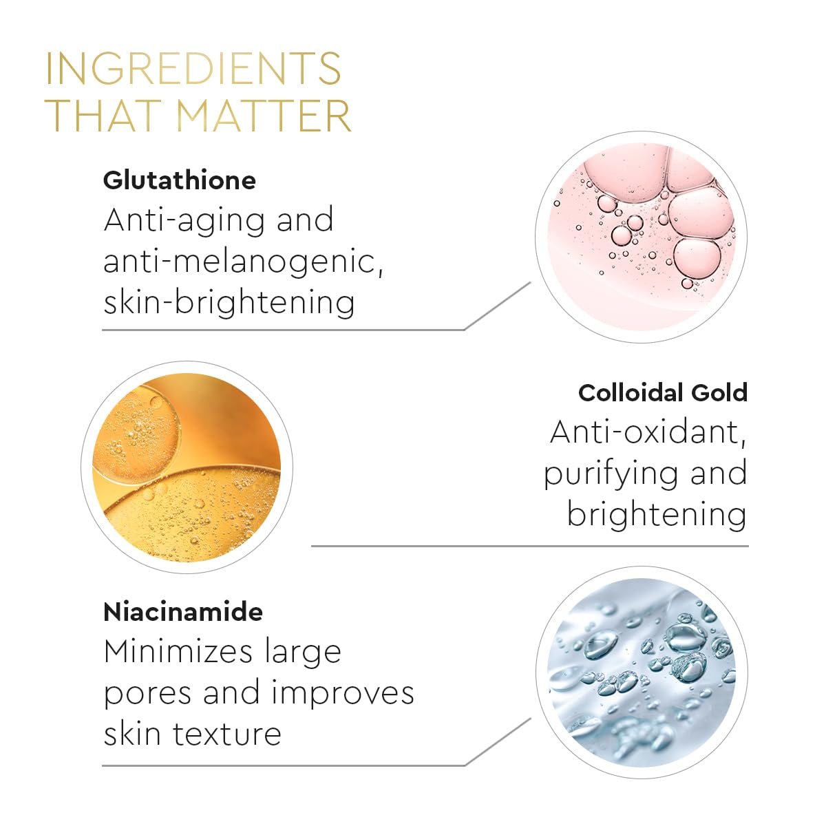 • 4) NOURISHING INGREDIENTS: Powered by 24-carat nanogold particles and Glutathione, that help purify the skin with antioxidants, fade fine lines and wrinkles, and enhance skin texture